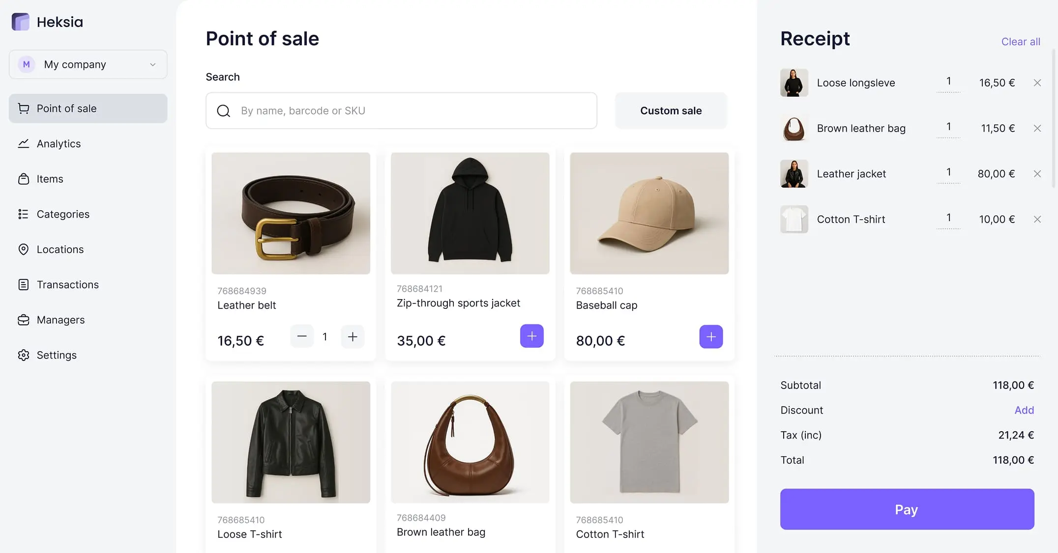 A Point of Sale (POS) system is a software solution that helps businesses manage sales, inventory, and day-to-day operations from a single, user-friendly platform. With Heksia, you can effortlessly process in-store transactions, monitor stock levels in real time, manage prices and SKUs, and access detailed reports — all in one place.